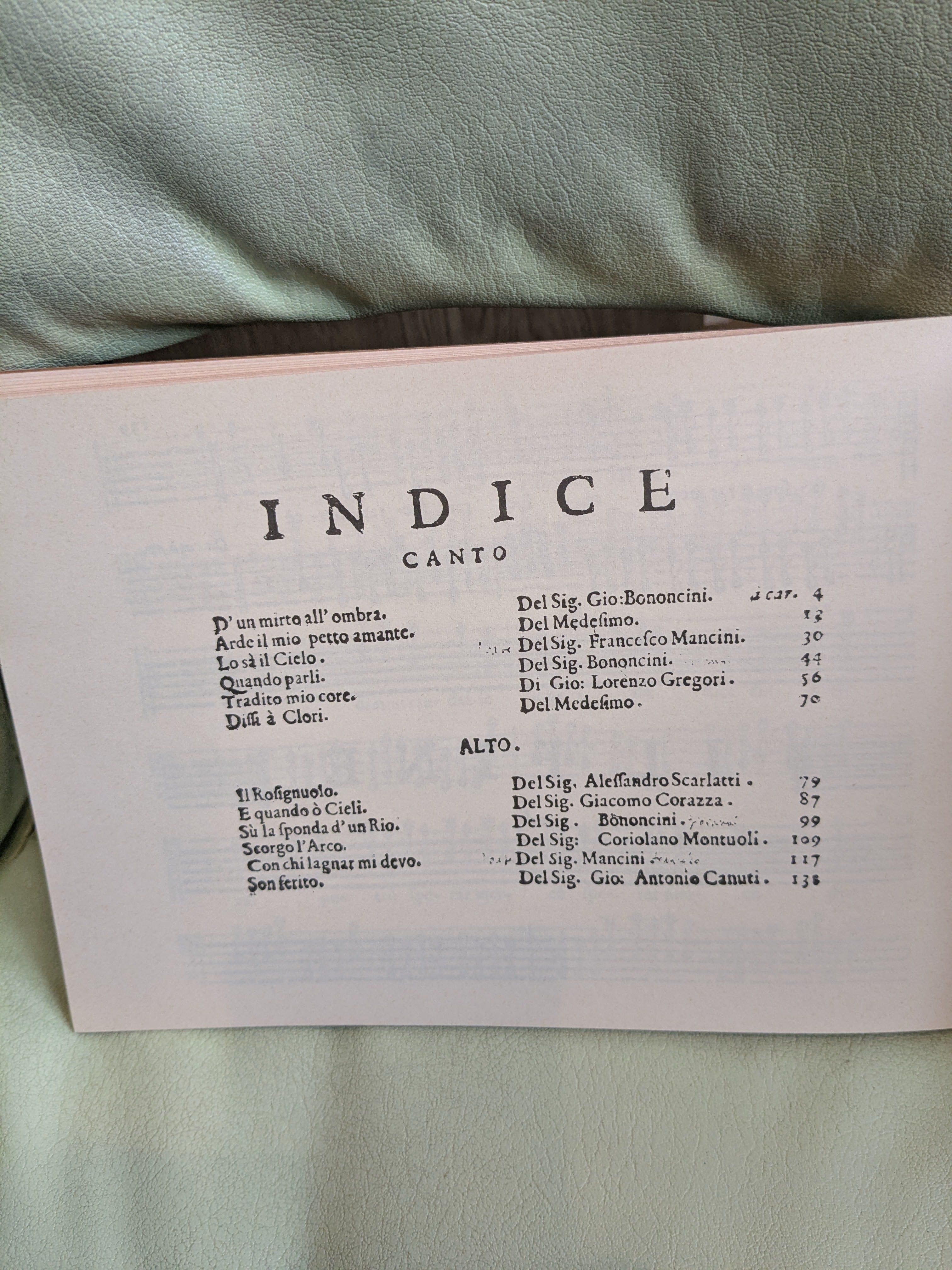 通奏低音、ファクシミリ、SD (1720 年頃)。タヴォラ: PER CANTO: 1. ボノンチーニ: D'un mirot all' ombra、2. メデシモ: Arde il mio petto amante、3. マンチーニ: Lo sà il cielo、4. ボノンチーニ: Quando parli、5. グレゴリ: Tradito mio core、6. メデシモ: Dissi à Clori、PER ALTO: 7. A. スカルラッティ: Il Rosignuolo、8. コラッツァ: E quando ó cieli、9. ボノンチーニ: Sù la sponda d'un Rio、10. モントゥオーリ: スコルゴ ラルコ、11. マンチーニ: Con chi lagnar mi devo、12. カヌーティ: Son ferito。ISBN: 978-88-7242-680-4, SPES