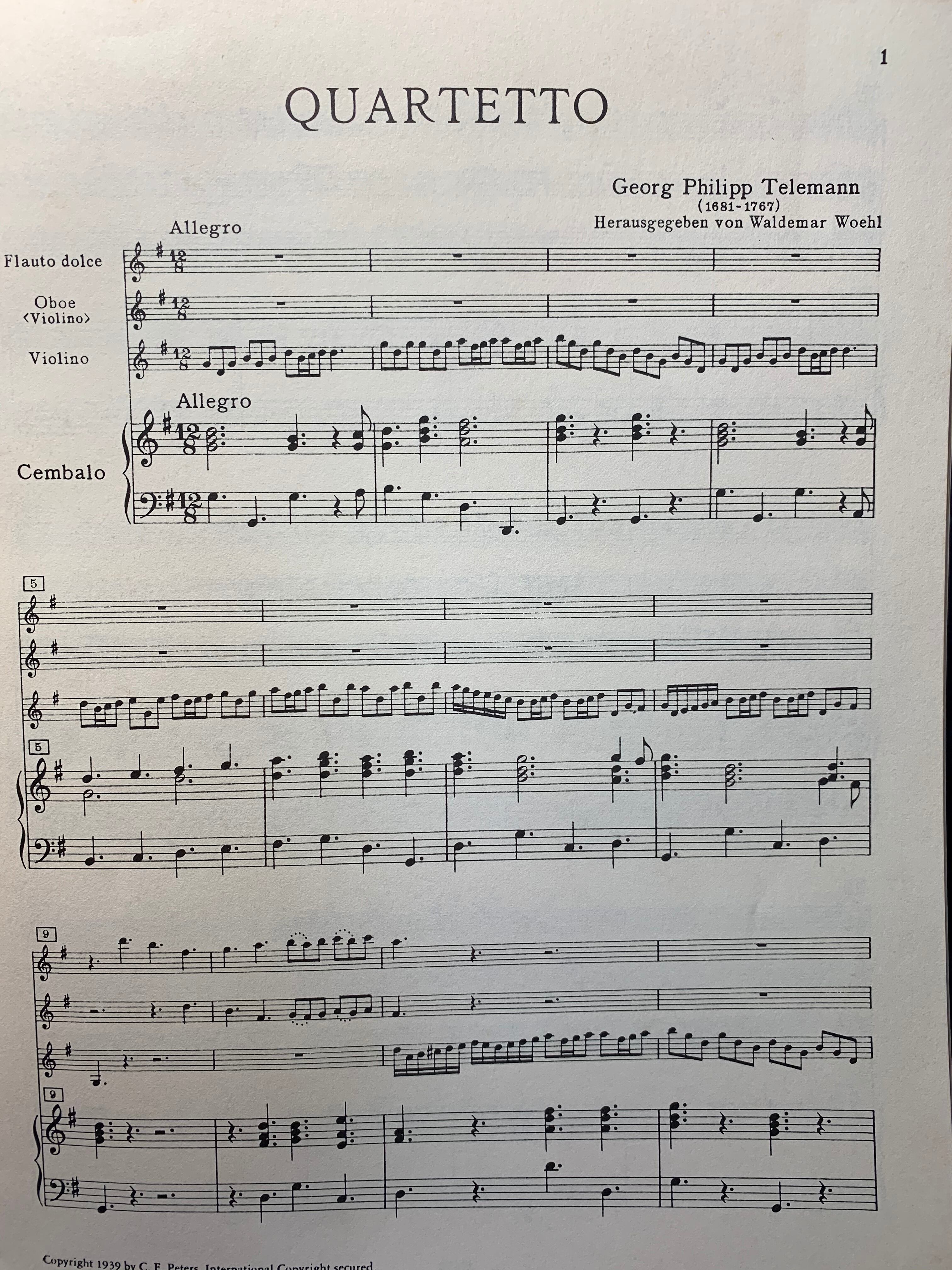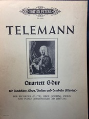 Quartett G-dur für Blockflöte,Oboe,Violine und Cembalo(klavier)【作曲者:TELEMANN】出版社:EDITION PETERS 1939年